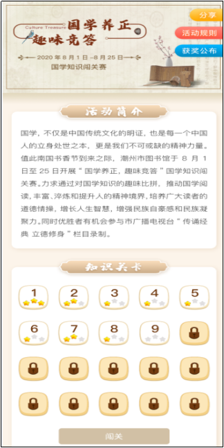 平台结合国家文化方针政策、重大节点、中国传统节日、地方特色文化、节日、社会热点,整合、策划、推送符合人民群众文化需求,推动社会主义文化繁荣发展的优质内容及阅读专题;提供直播、作品征集、线上投票、专家评审、线上培训、线上答题、线上竞赛等活动工具,馆方提供讲座、培训、展览、竞赛等线上阅读推广活动的策划及辅助执行,丰富人民群众的精神文化生活;打造三大用户激励体系,通过荣誉激励、情感激励、物质激励等方式,不断提升平台活跃和高频用户数,增加读者粘性。
