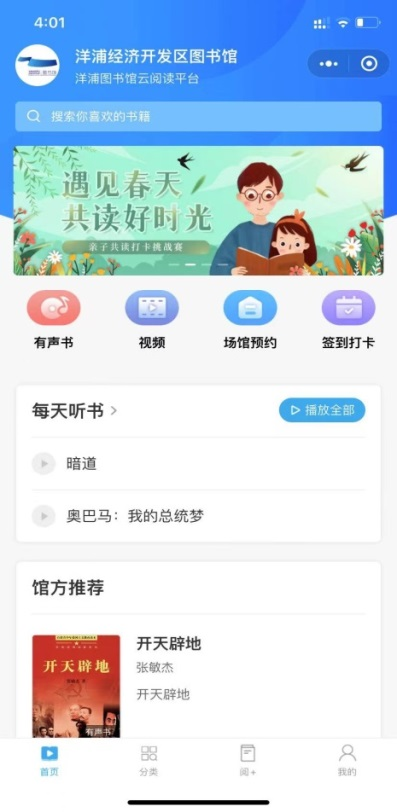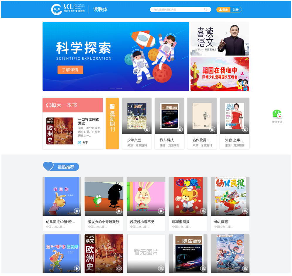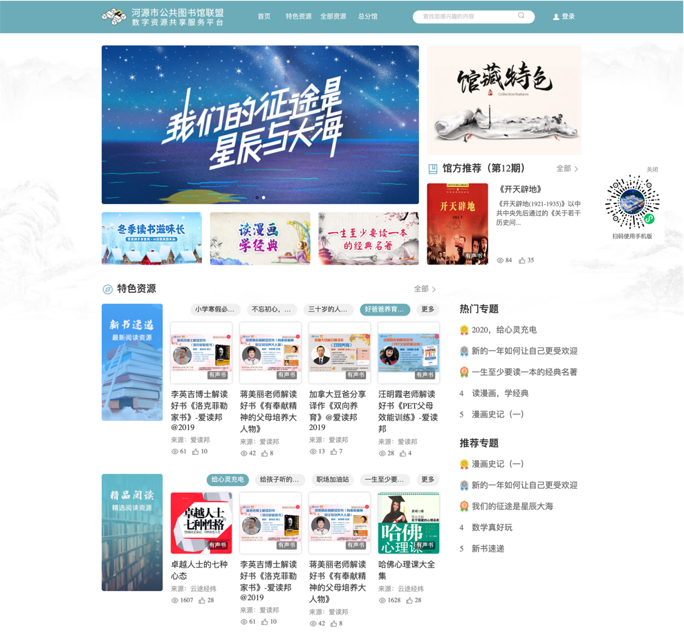 为文化服务机构提供资源整合服务,实现自建、采购、试用和共建共享资源的统一检索和在线阅读,读者可以进行扫描二维码实现电子书、有声书、视频等资源在线阅读。读者通过阅读数据随时掌握自己阅读情况。